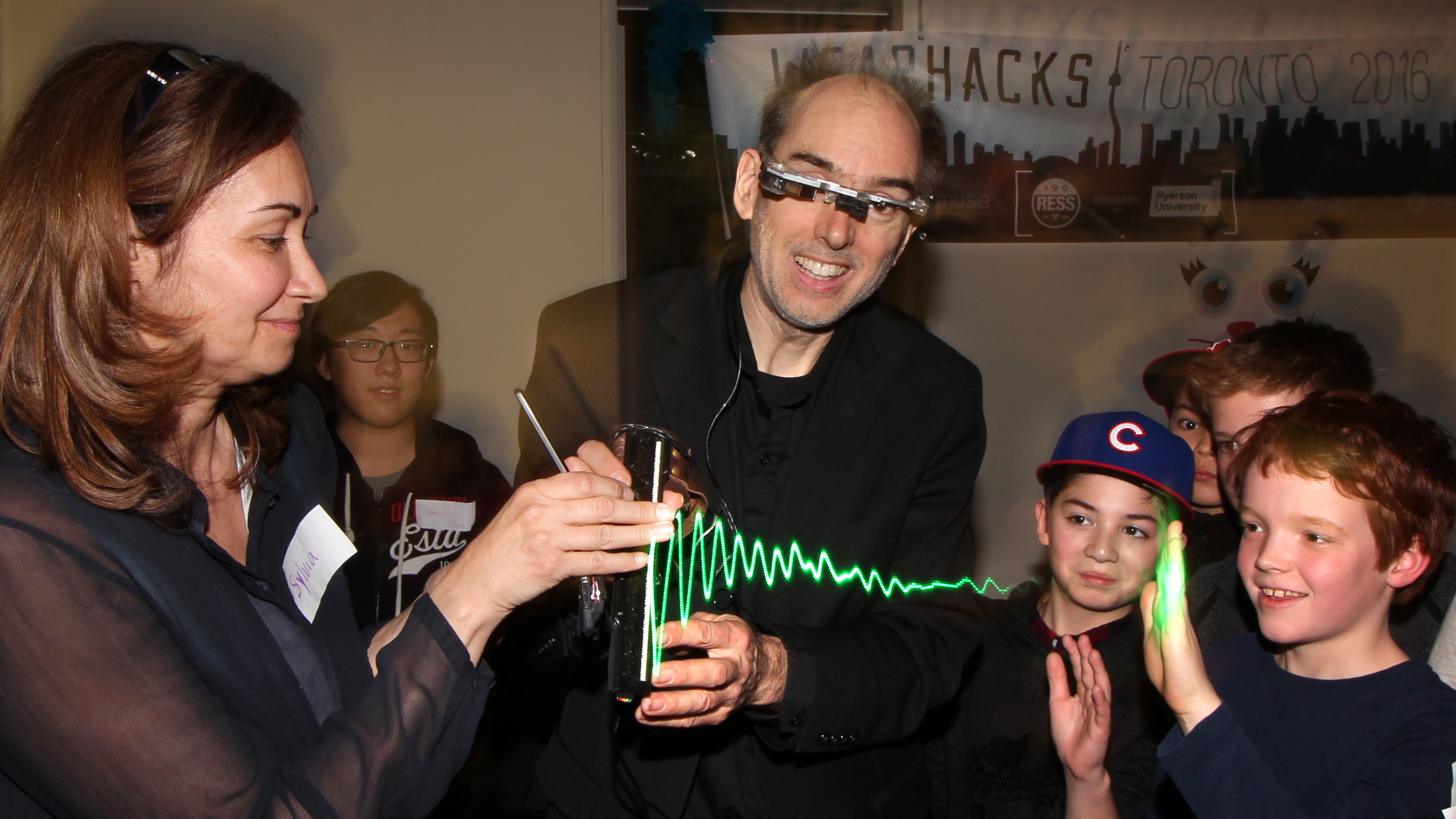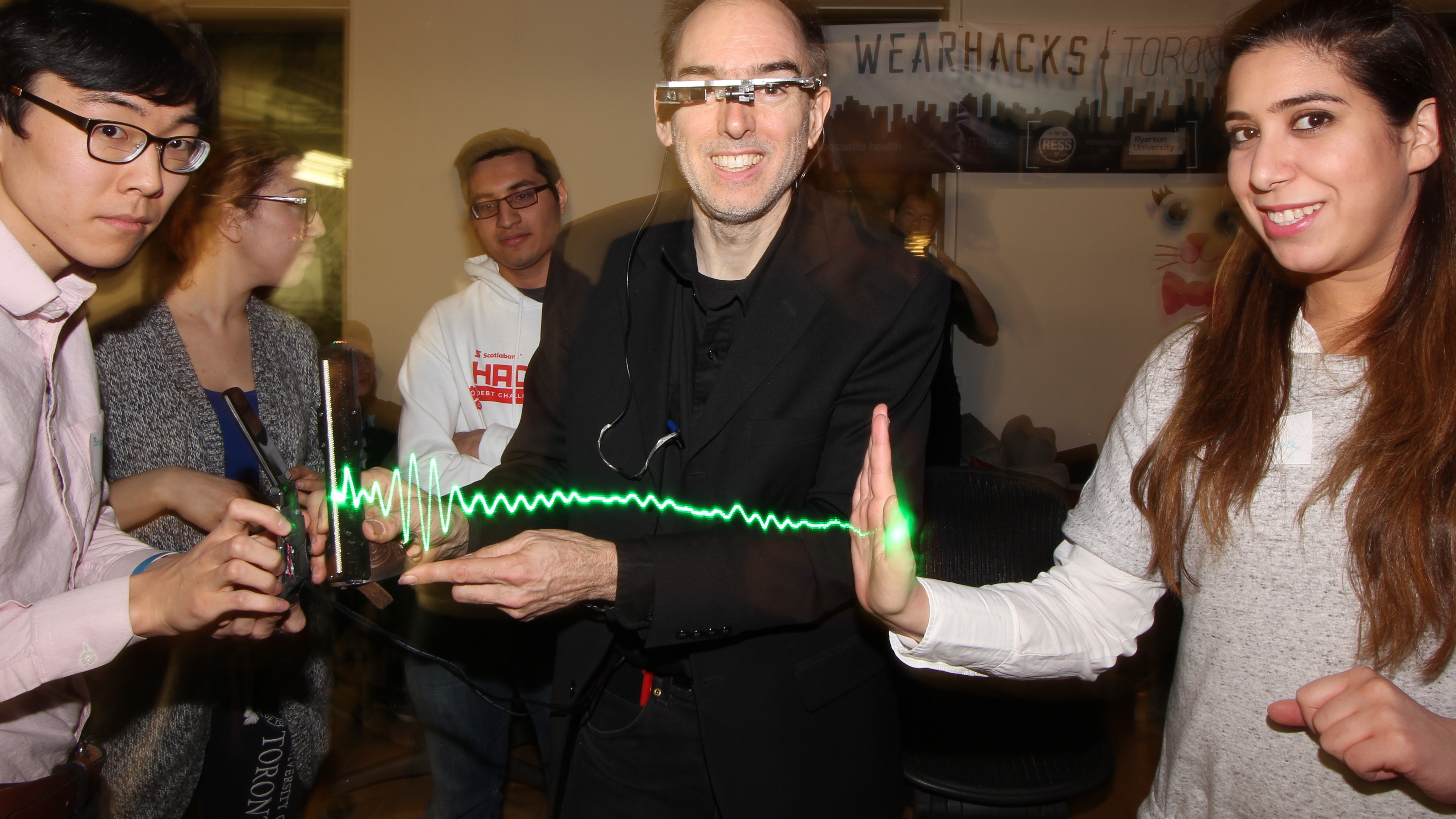 Among many live demos was the S.W.I.M. (Sequential Wave Imprinting Machine) wearable computing and augmented reality system Mann originally built at the age of 12, back in 1974, to measure the speed of light and the speed of sound, and, more importantly, to express radio waves in a coordinate system that moves at the speed of light, with the waves, so as to make them appear to sit still (or at the speed of sound for sound waves), as Phenomenological AR (Augmented Reality) overlays.