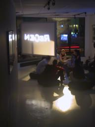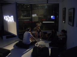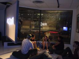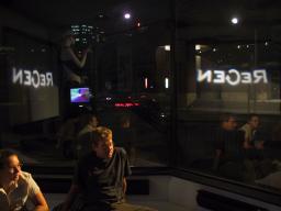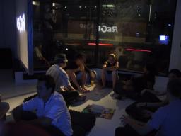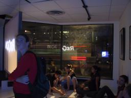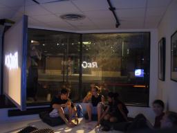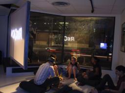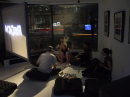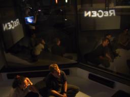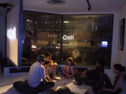 There are two lights outside the building, one to shine in through the downstairs windows, and another for the upstairs windows. A typical setting of brightness equivalent to 88 watts was found to produce a nice pleasant lighting where shadows cast by the window frame creates an illusion of sunlight to make the environment seem brighter than it really is. Additionally, because the light comes from outside the building, the reflections in the windows produce a feeling of duplicity, and, because of the 45 degree angle between the windows, also a feeling of quadplicity. Thus the outdoor light source gives the space a large open bright feeling with only a minimal consumption of electricity.