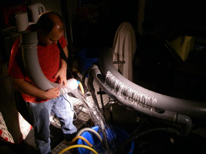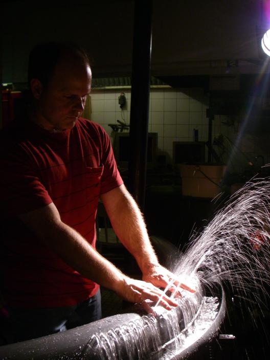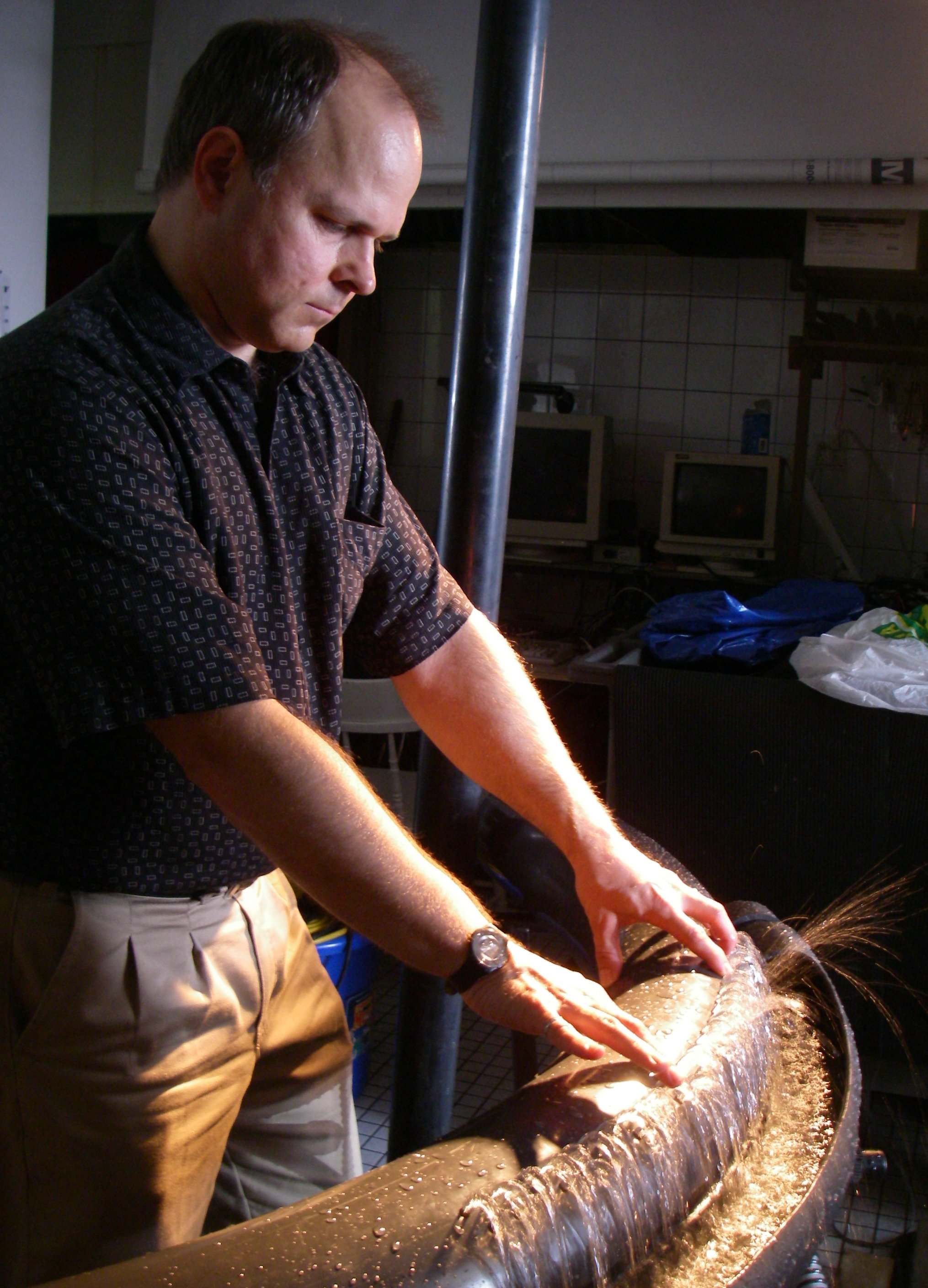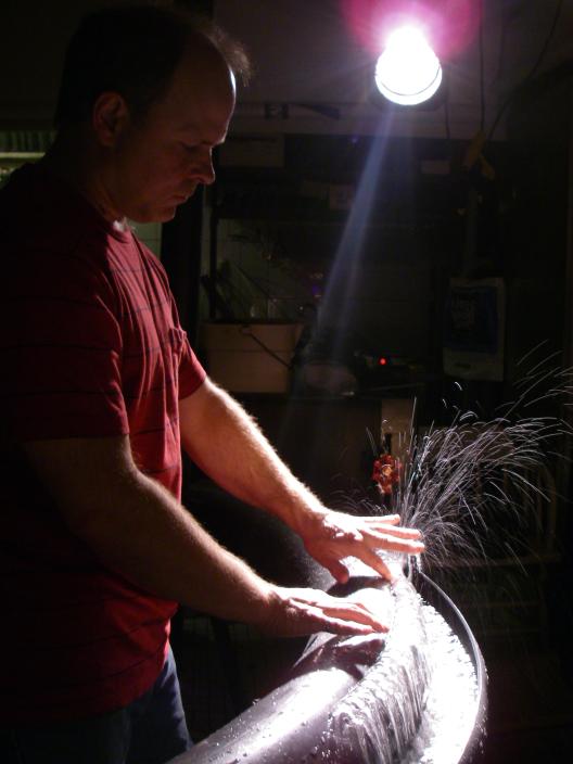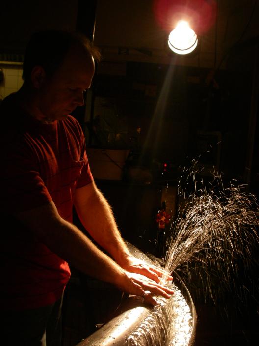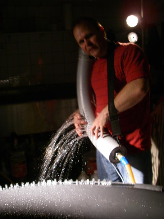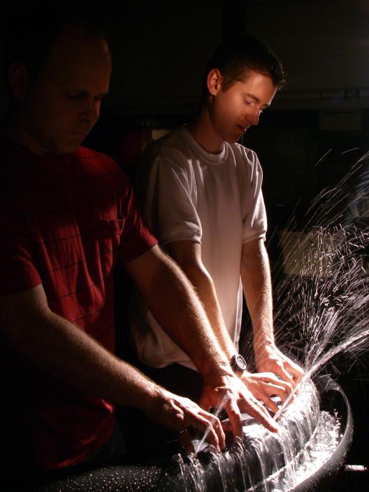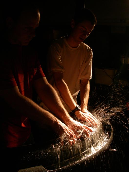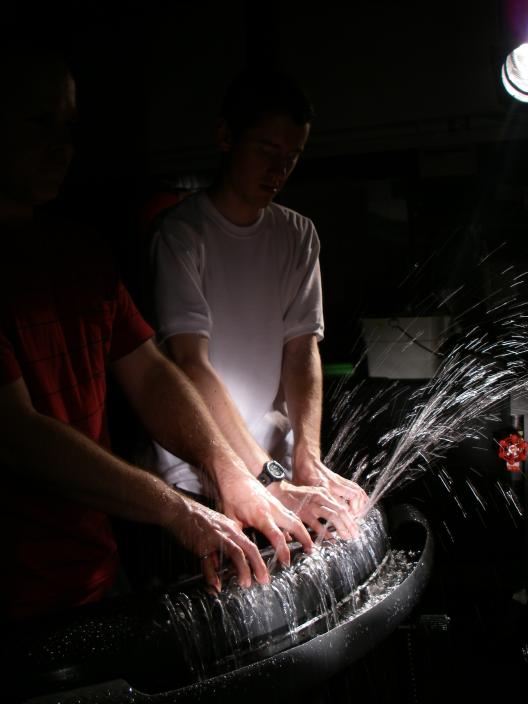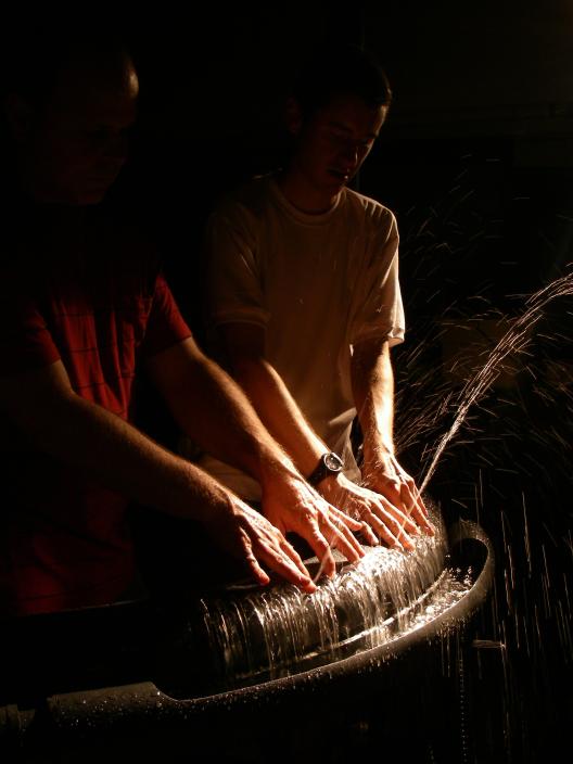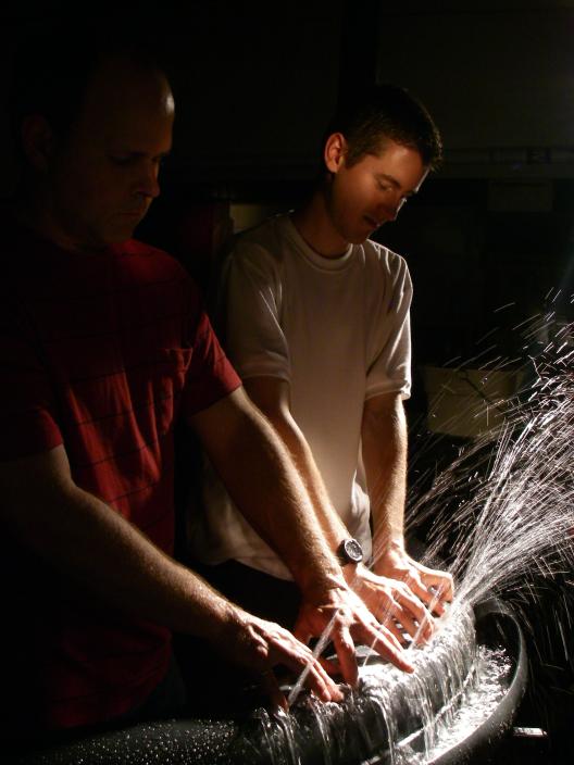 Water (liquid), played with a 45-jet hydraulophone; Wind (gas), played with
