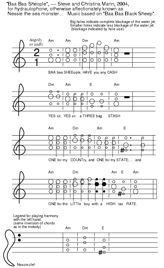 (Sing to your children, to the tune of Baa, Baa, Black Sheep) Arranged in a minor key, S. Mann, 2004 (using 3 chords: Aminor, Dminor, and Emajor) Am Am Dm Am BAA baa SHEE-eople, HAVE you any CASH; Dm Am E Am YES sir, YES sir, a THREE bag STASH; Am Dm Am E Am ONE for my COUNTry and ONE for my STATE; and Am Dm Am E Am ONE for the LITTle boy with a HIGH tax RATE.