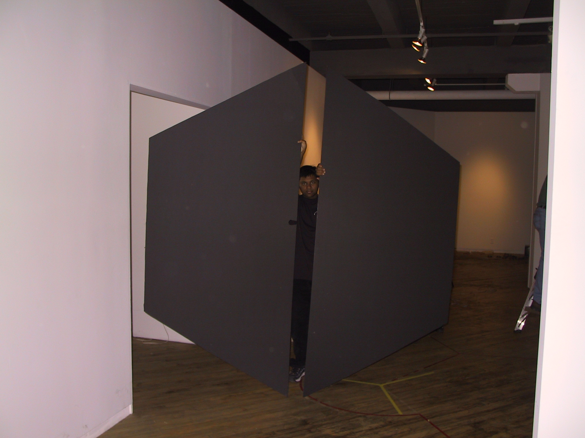 showing, in yellow tape, where the rotors of a turnstile will go.