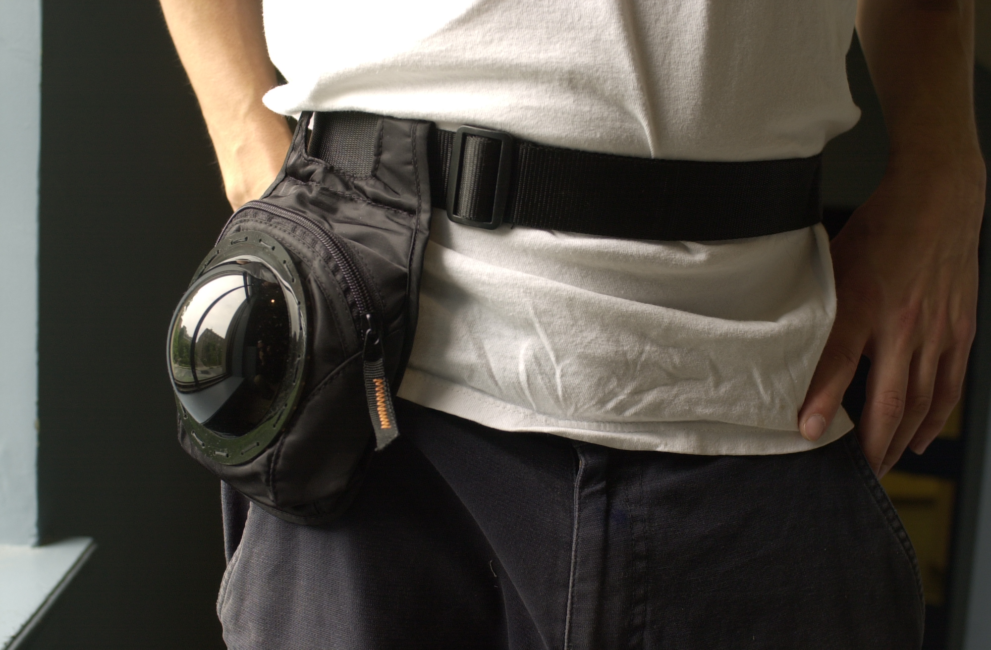 Alternatively, no transmitter or recording device is needed. Simply wear the waist pack as a deterrent against crime. With such a conspicuously concealed camera, nobody will know whether or not you're live, so they will simply have to be on their best behaviour at all times.