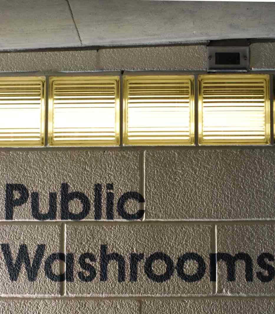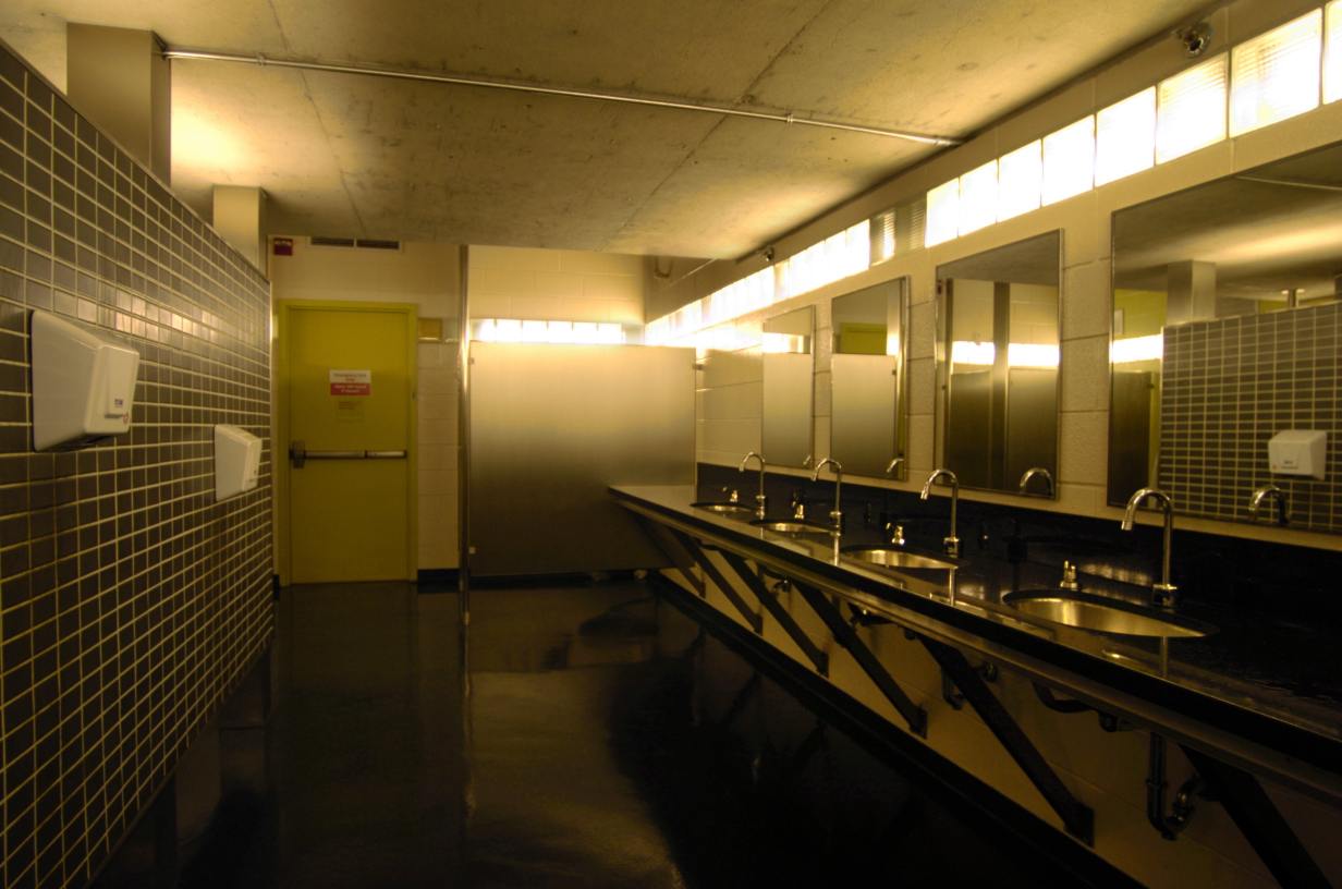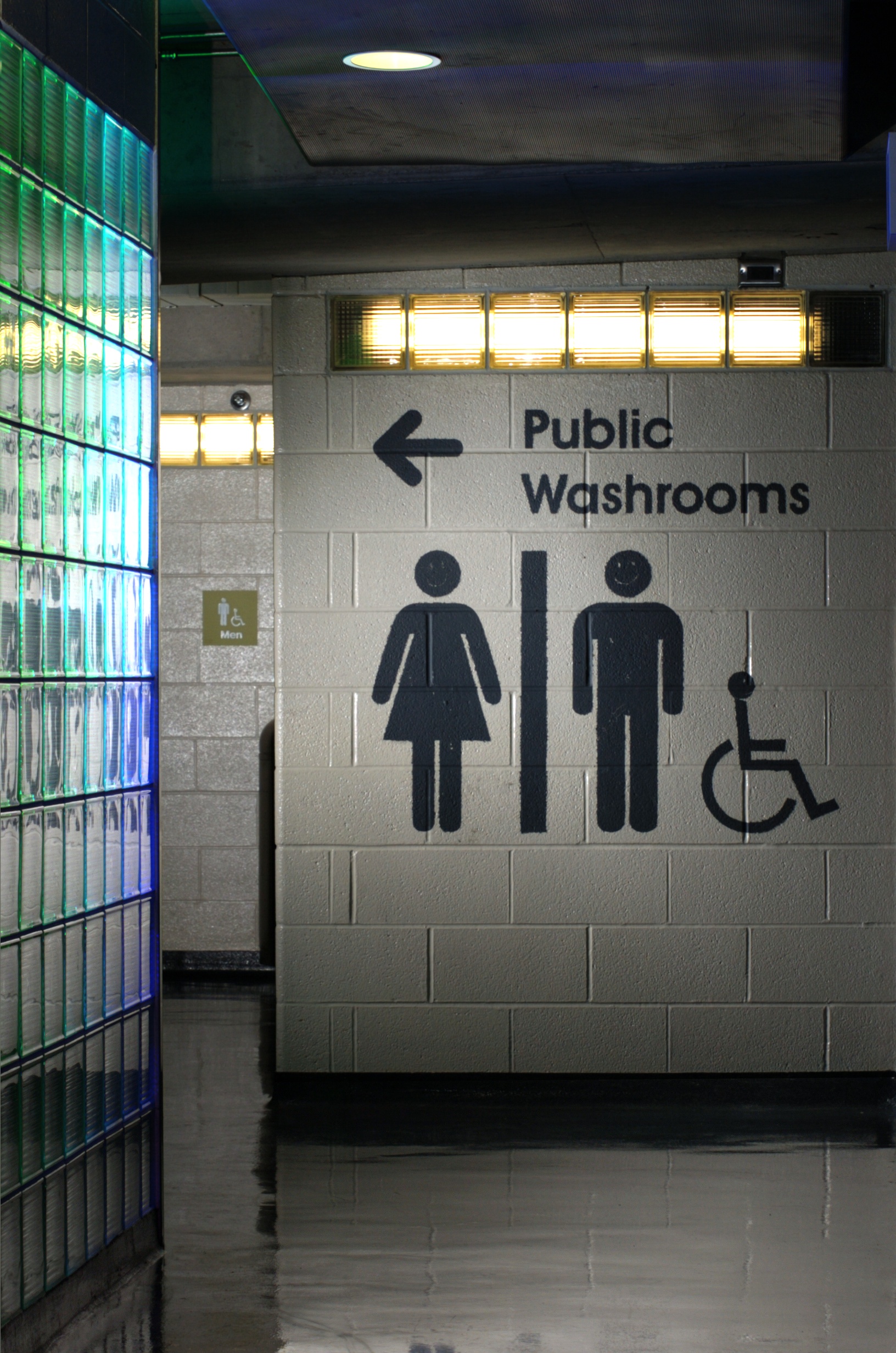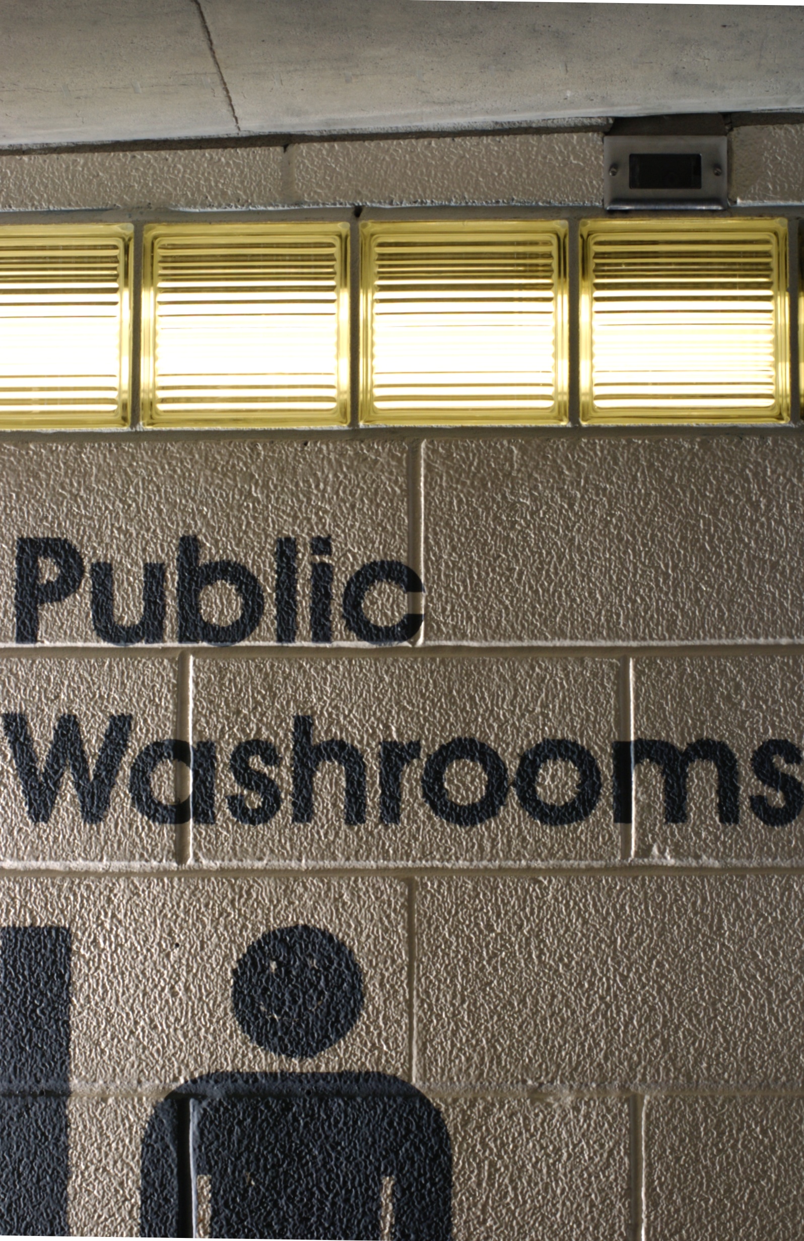 Windows all the way around the outside of the washrooms have lights behind them, to create the illusion of extensive natural light, even though the washrooms are underground. The windows are made of glass brick, permanently cemented in place. Lighting is installed in service tunnels that run around the outside of the washrooms. This provides optimum safety from electrical shock (keeping the lights outside the washrooms), hygiene (no cracks or openings), security (no way for vandals to access the light bulbs), and aesthetics (clean architectural lines that maintain a continuity of the raw industrial urban aesthetic).