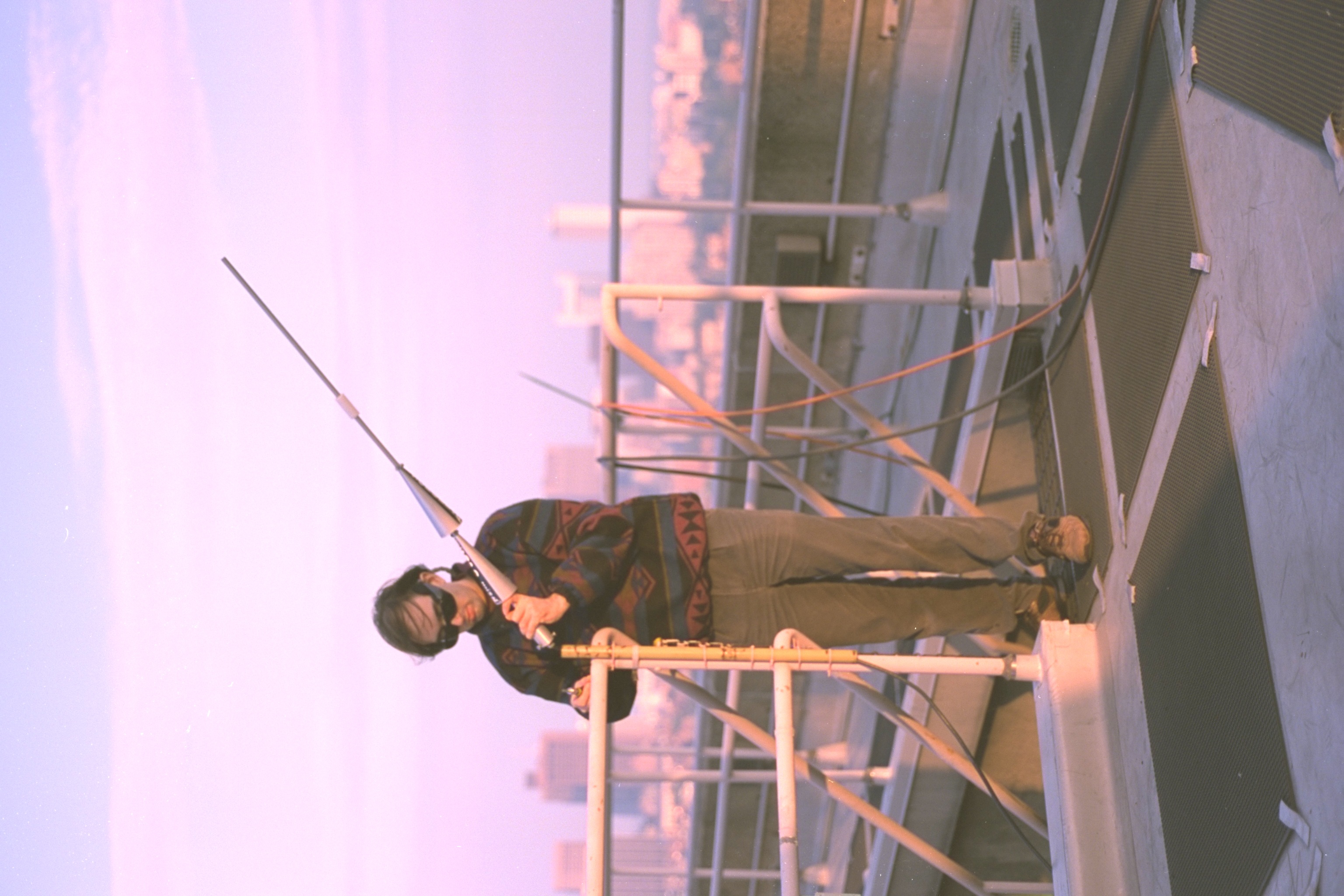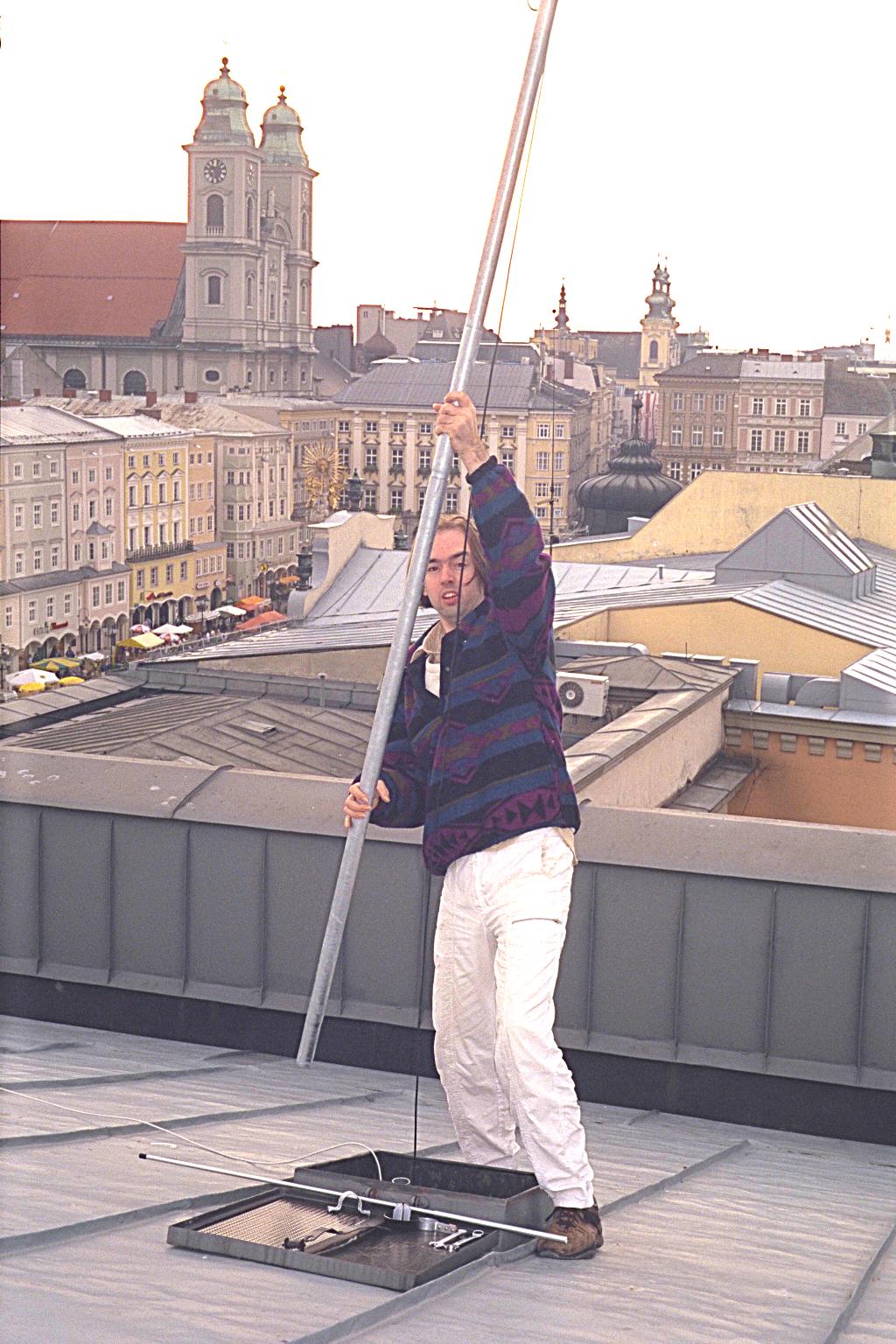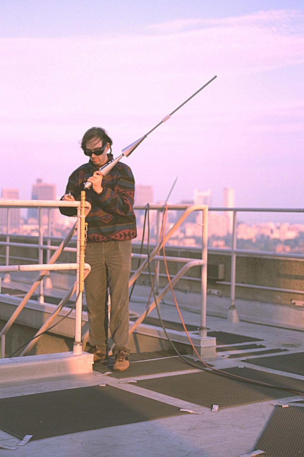 one of the N1NLF gateway antennas (i'm wearing "WearComp7" while installing the antenna) My typical setup when I travel to other countries, etc., to give invited lectures or the like: